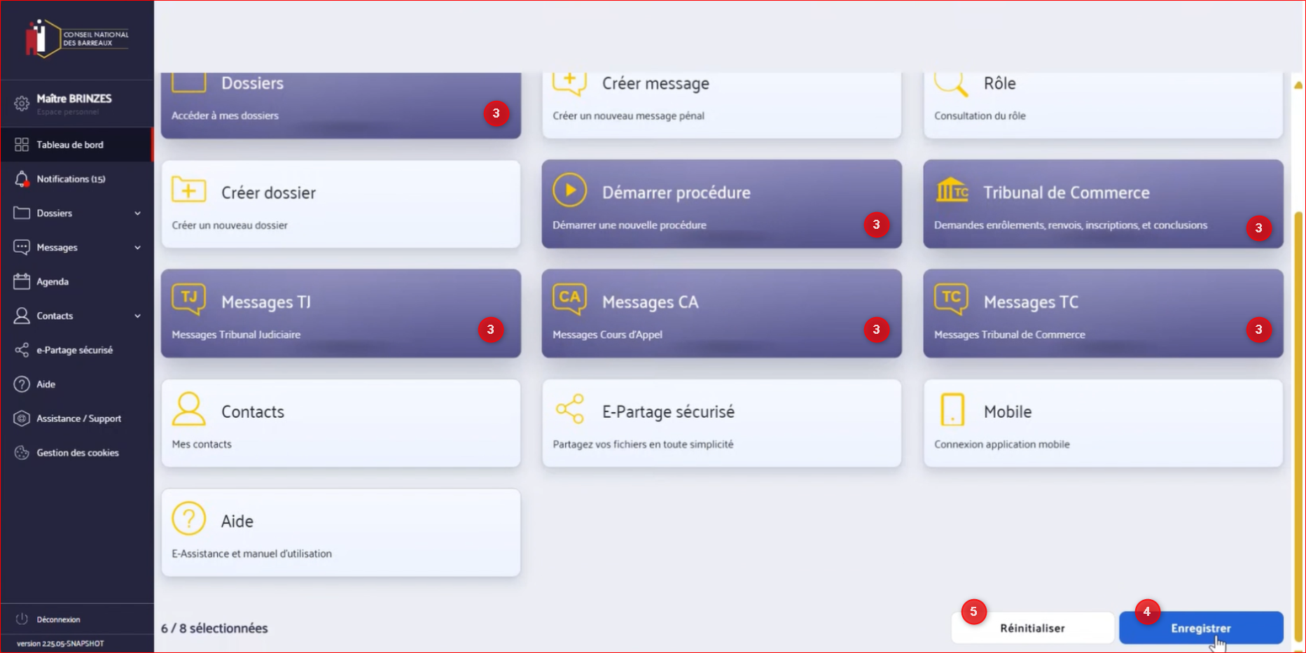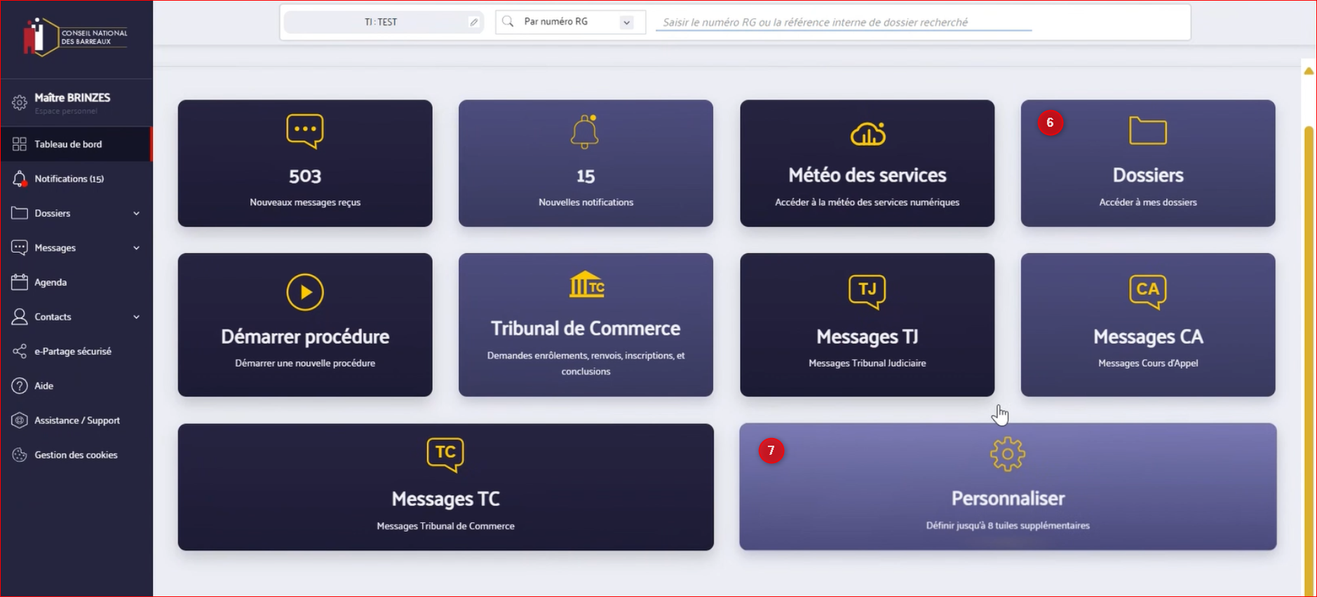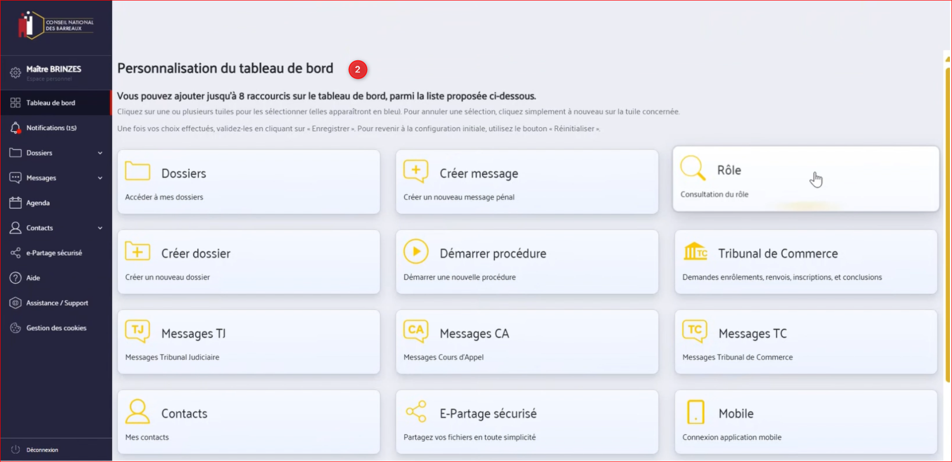 7- En cliquant sur "Personnaliser" vous avez la possibilité d'épingler sur votre tableau de bord jusqu'à 8 éléments qui seront ainsi en accès direct dès que vous accédez à e-Barreau ou que vous revenez sur la page d'accueil. Pour plus d'informations, consultez ci-dessous l'article détaillant la marche à suivre pour personnaliser votre tableau de bord.