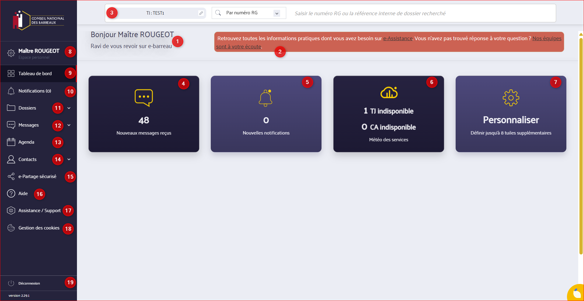 Lors de la connexion à e-Barreau, vous arrivez directement sur la page d'accueil, également appelée Tableau de bord.