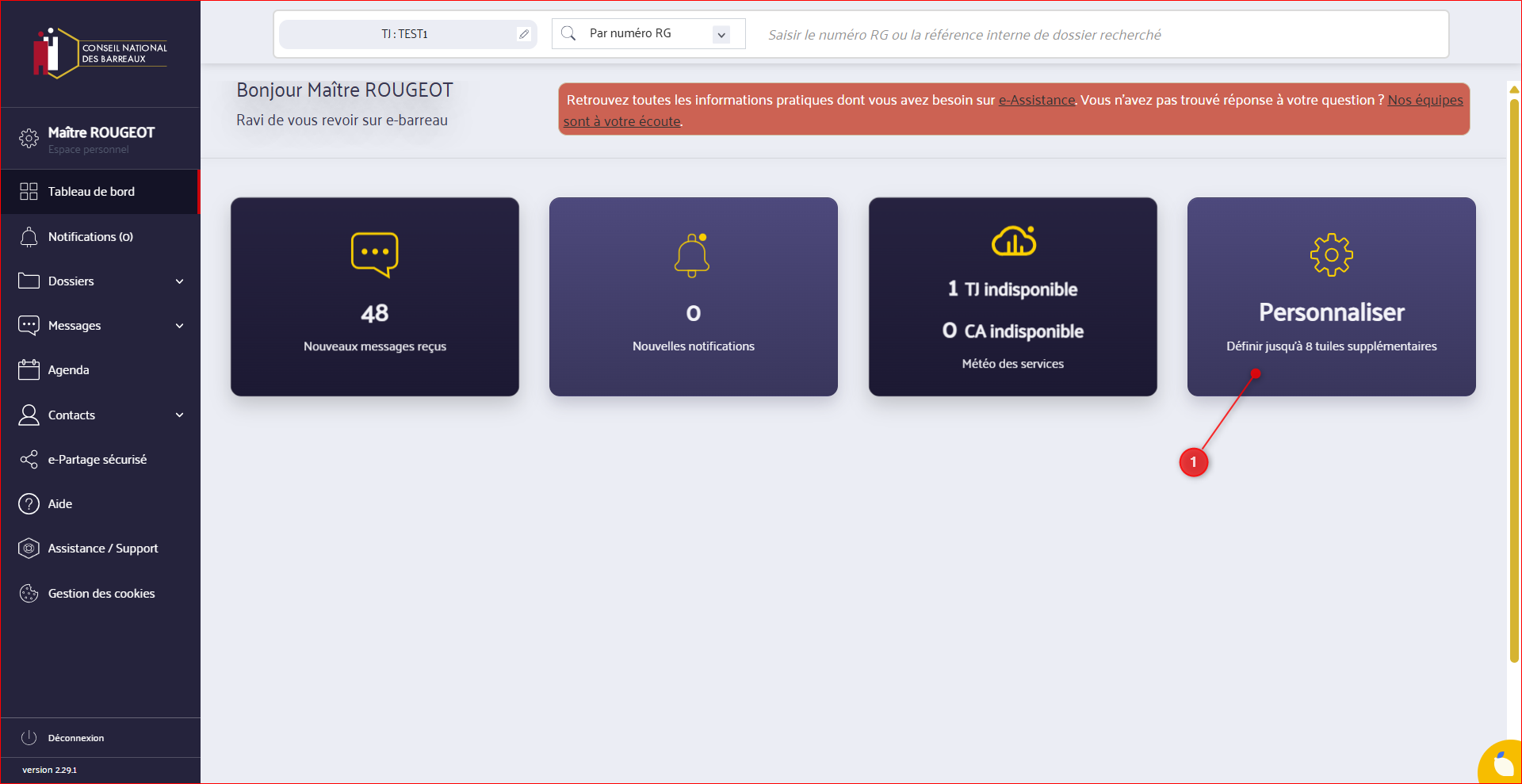 1- Vous êtes connecté à e-Barreau et vous arrivez sur la page d'accueil, appelée également Tableau de bord. Pour personnaliser cette page, cliquez sur "Personnaliser".